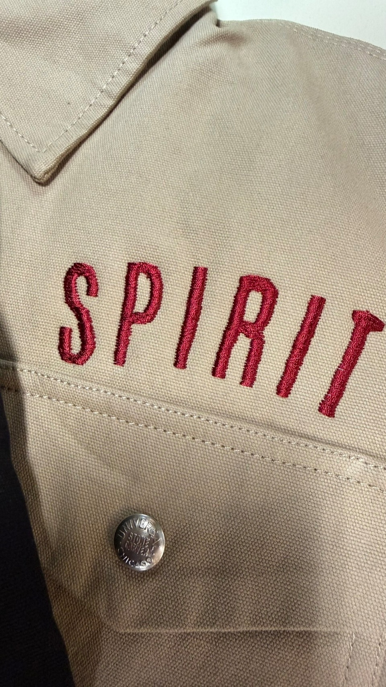 UNIVERSAL OVERALL ヘリテイジシリーズのワークジャケットに、刺繍作家「思案刺繍」による横振り刺繍を一点一点施しました。