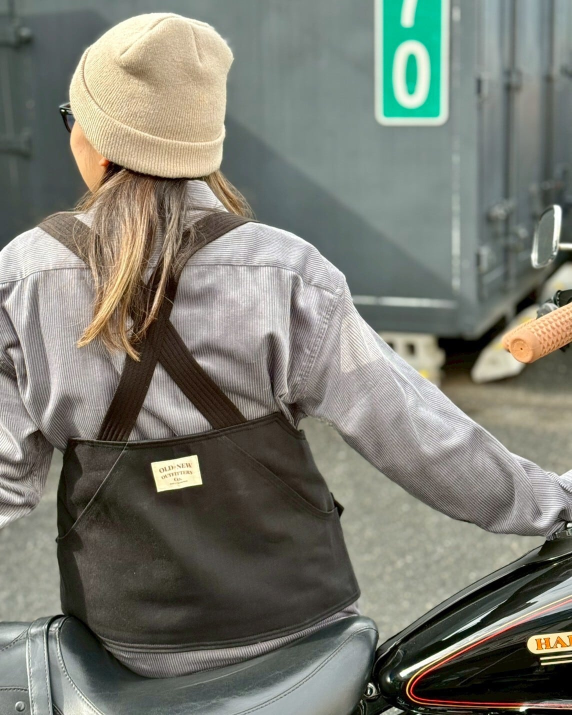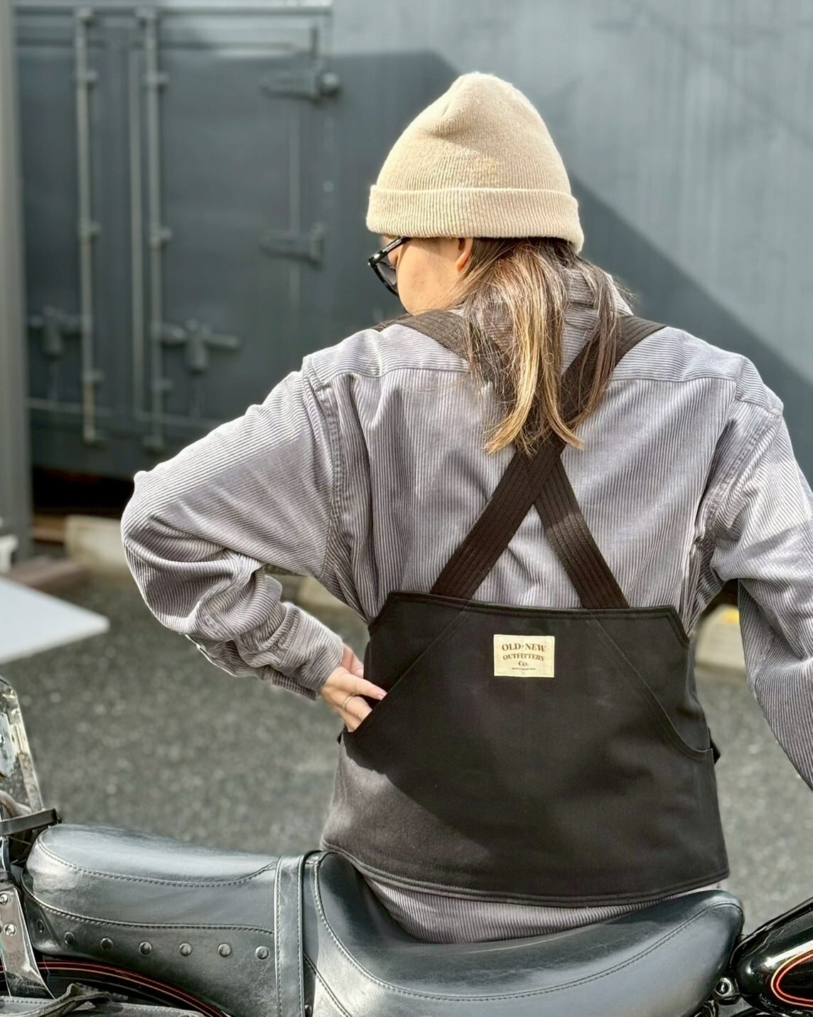 厚手のキャンバスをベースに、背面のクロストラップ構造でライディング時のフィット感を追求。