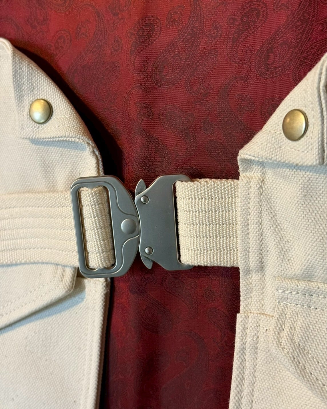 厚手のキャンバスをベースに、背面のクロストラップ構造でライディング時のフィット感を追求。