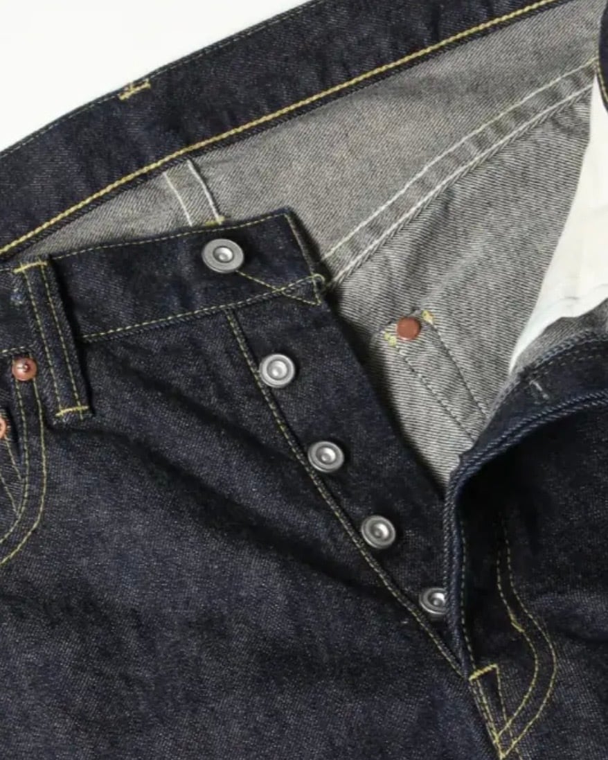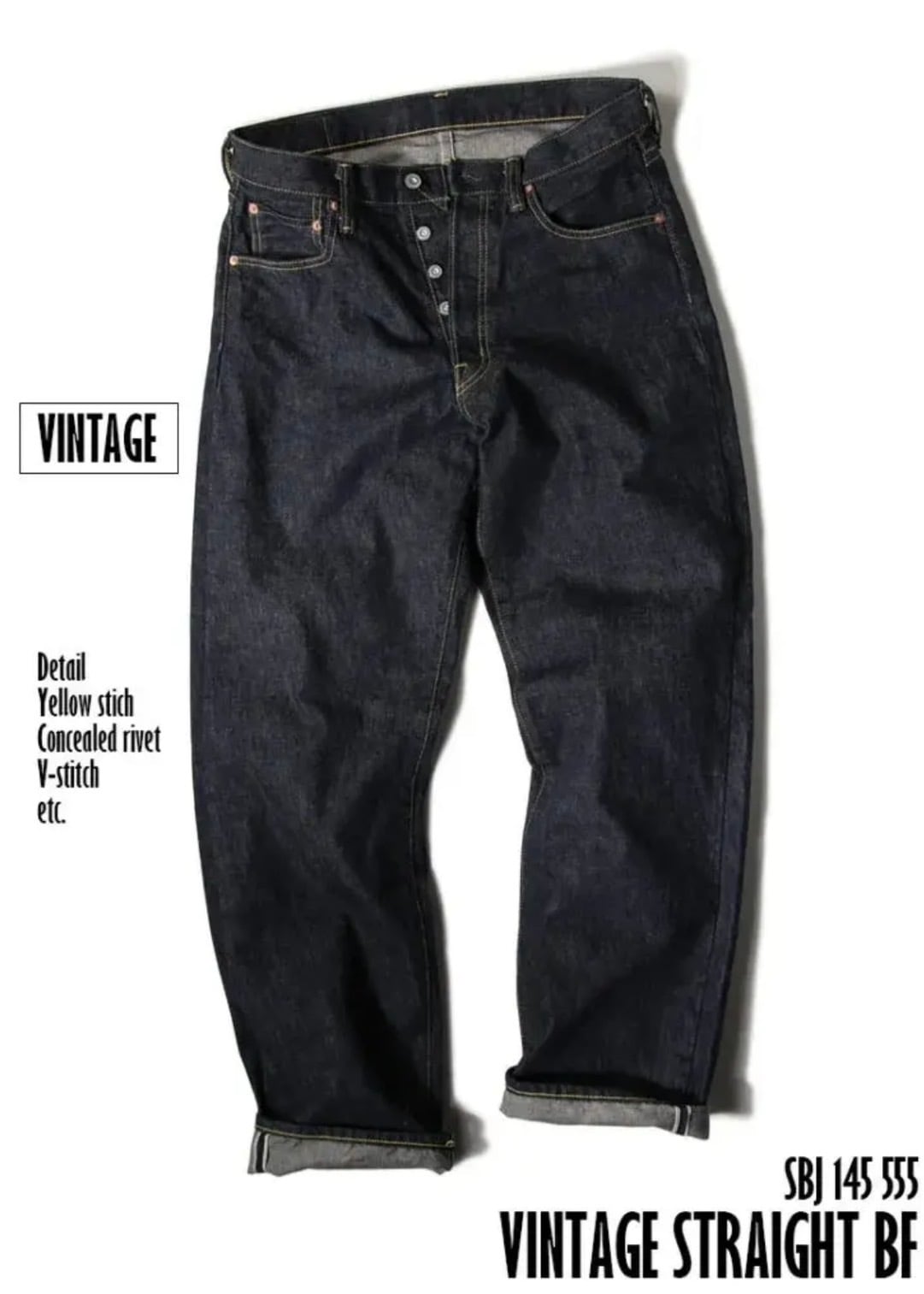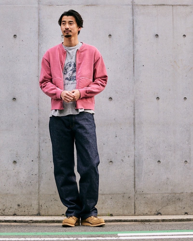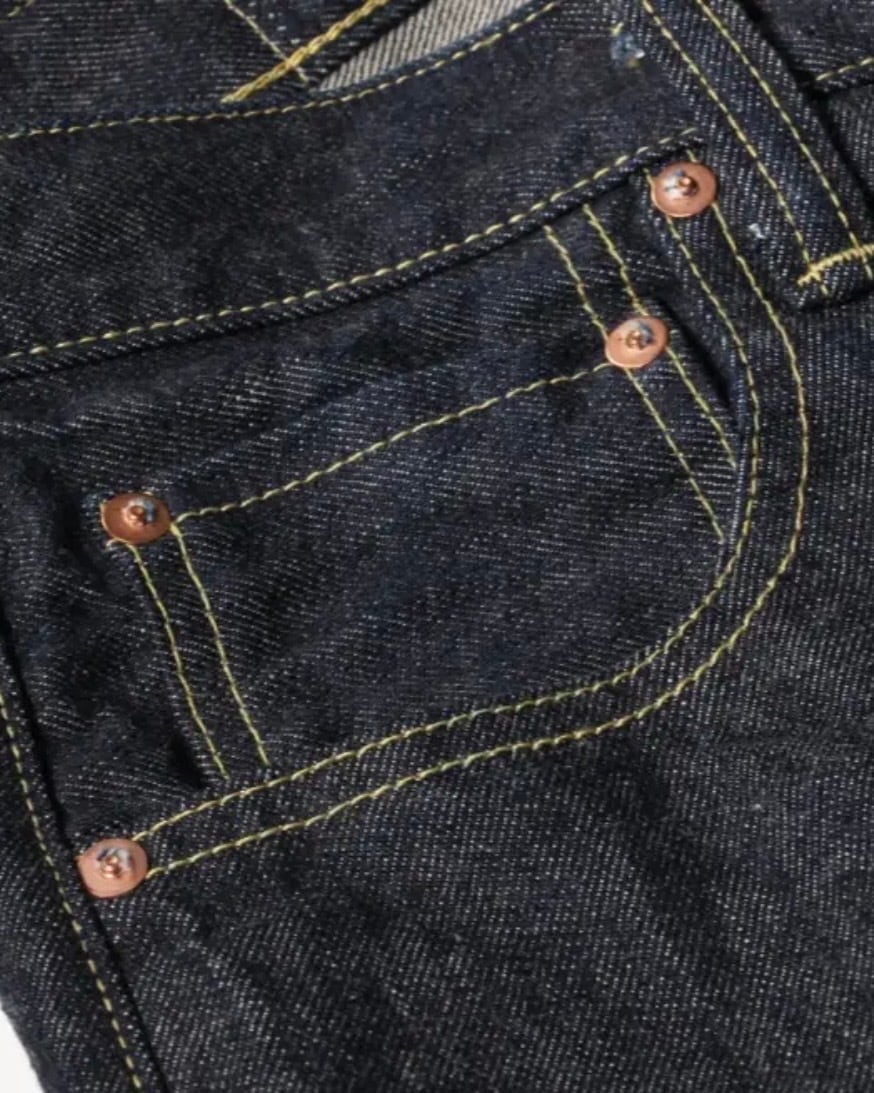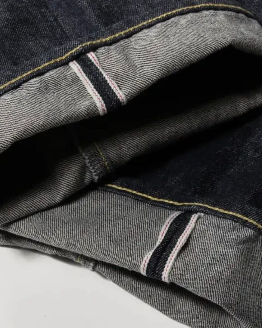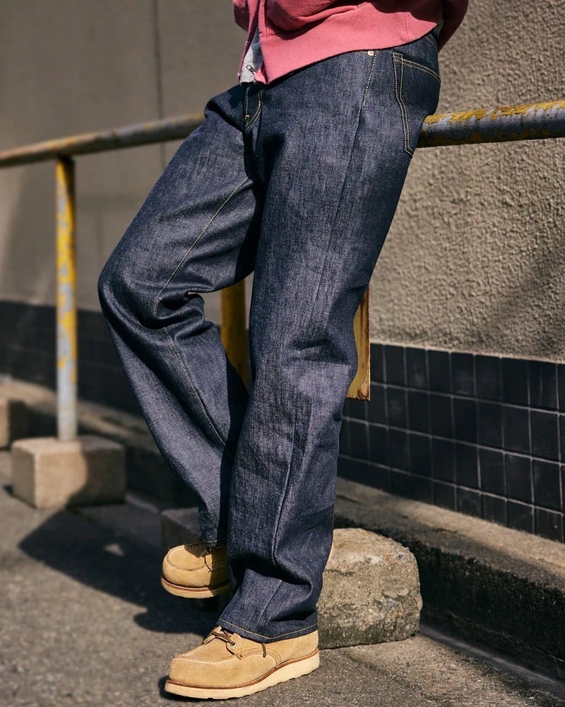 50年代をイメージした太めシルエットのジーンズ。ジーンズがファッションアイテムとして広がりを見せ始めた1950年代の武骨で野暮ったさを残したゆったりとしたストレートシルエット。腰回りにゆとりがありつつも裾にかけて落ちるラインは、当時の若者文化や映画スターに象徴されるクラシックな50’sスタイルを色濃く反映しています。赤耳セルビッチデニムを用い色落ちする縫製糸『コアヤーン』にて縫い上げました。革パッチにはディアスキン(鹿革)を使用。デニムはもちろん長年の使用で糸や革パッチも経年変化を見せ、それぞれでエイジングがお楽しみいただけます。
