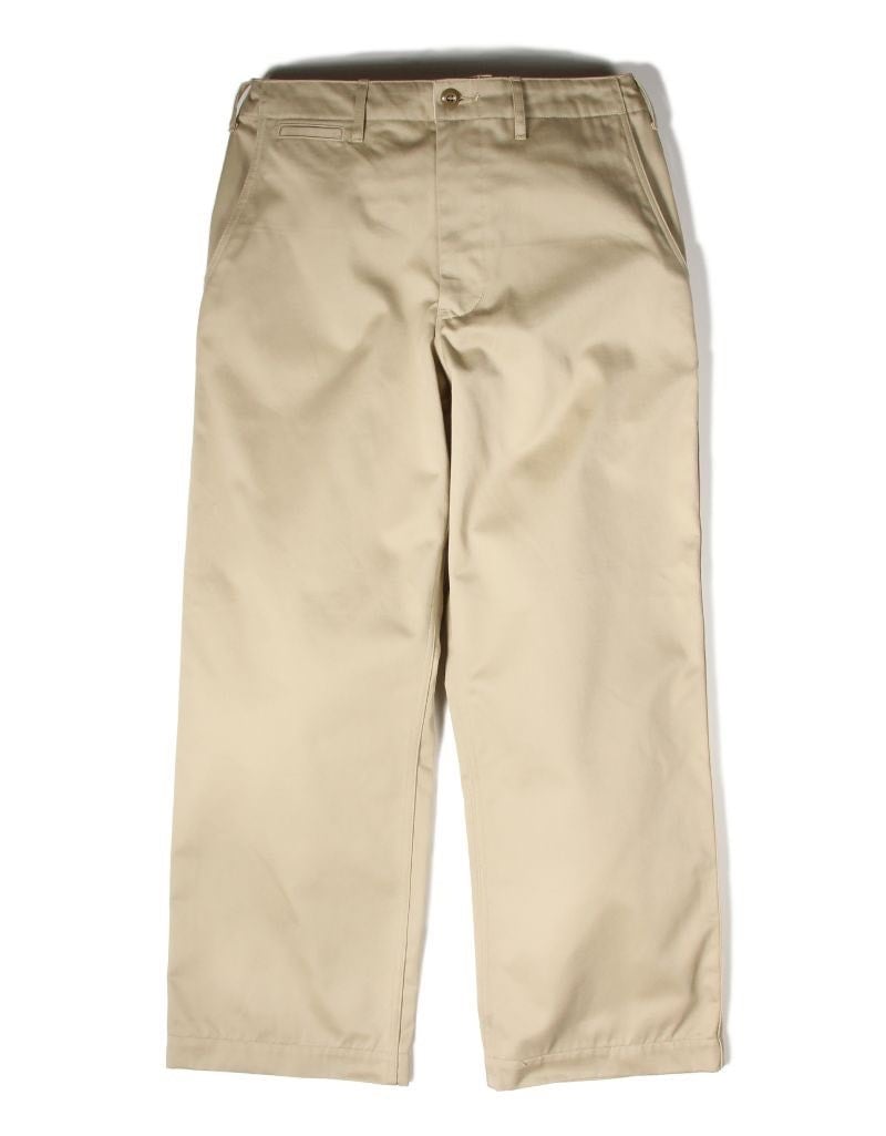 耐久性に優れたT/C素材を採用し、深めの股上とワイドなレッグラインが特徴。がっしりとした佇まいながらも、程よいハリと軽快な穿き心地を兼ね備えています。
