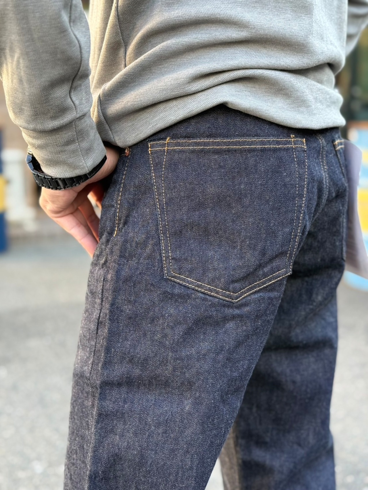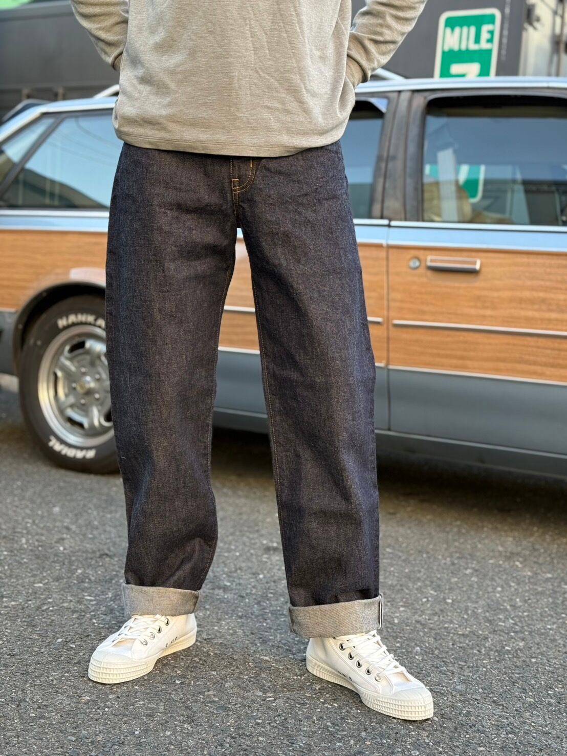 かつて90年代の古着シーンで人気を集めたシルエットをベースにサイズアップし、ヒップラインを緩くしたリラックスできる穿き心地のジーンズです。膝から裾にかけての程よいテーパードはそのままに、抜け感のあるシルエットへと進化。クラシックなストレートに近い印象ながら太すぎず細すぎない絶妙なラインは、カジュアルなスタイルにも、ややきれいめなコーディネートにも自然に馴染むオールラウンドなジーンズです。
