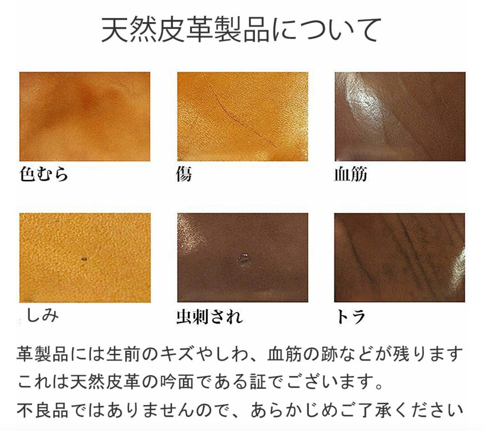 天然皮革を使用しており、1つずつ革質が異なり染め上がりの色ムラやキズ・シワがあり、