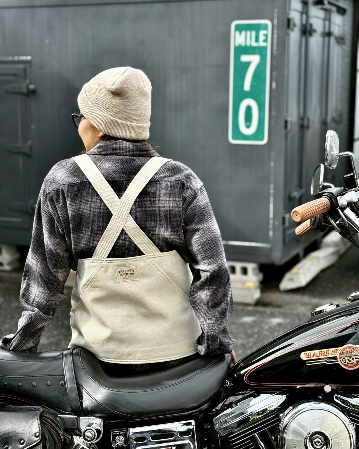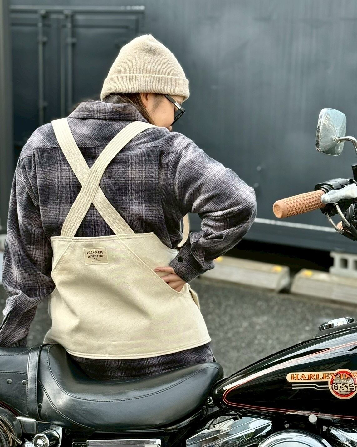 厚手のキャンバスをベースに、背面のクロストラップ構造でライディング時のフィット感を追求。