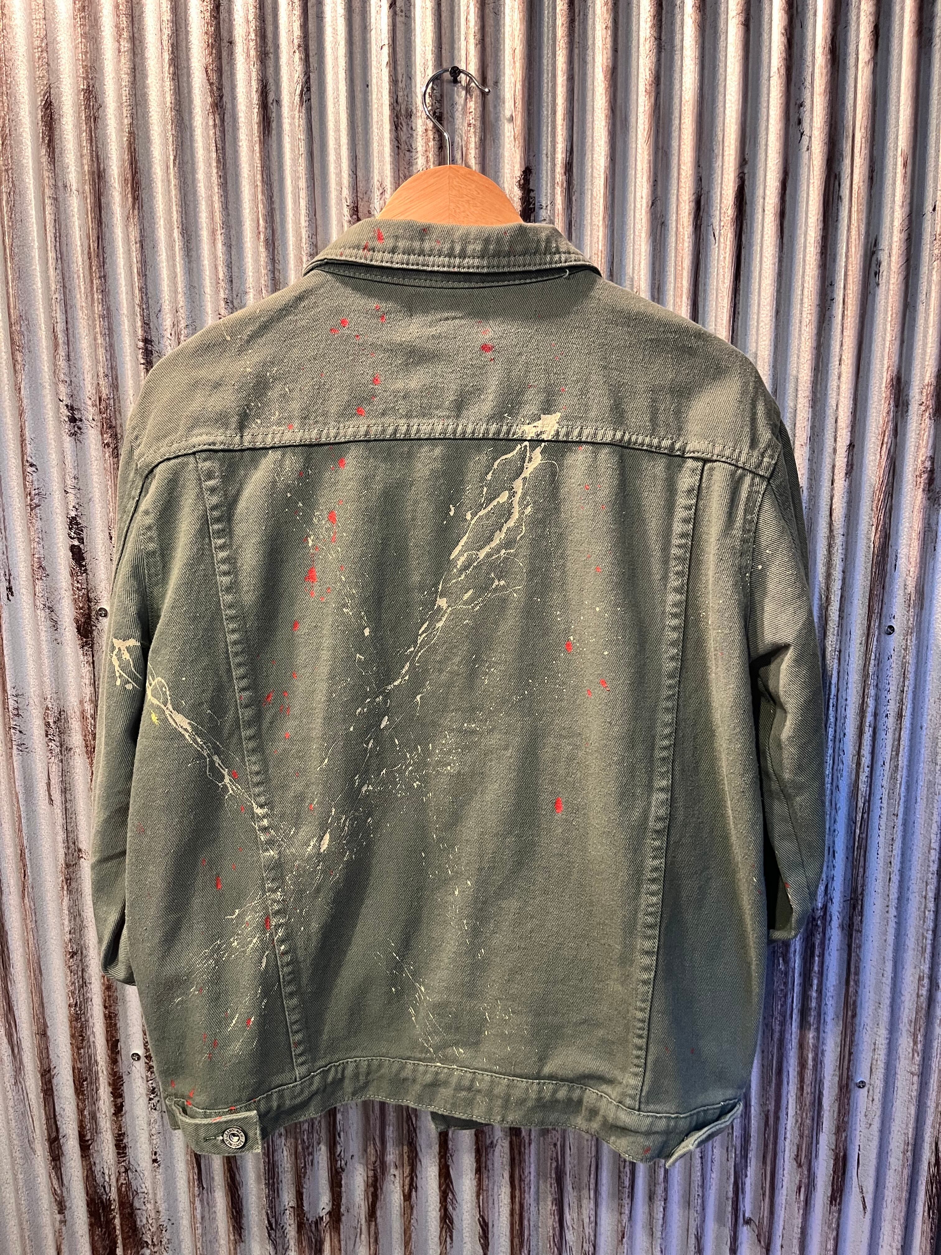 スパッタリングといった技法で装飾された、OLDNEWオリジナルデニムジャケット。
